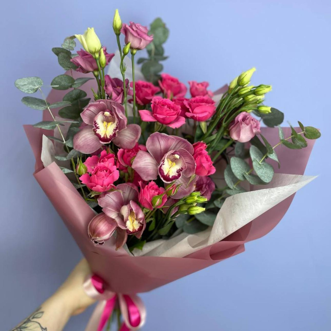 Орхидея , Роза кустовая, Эвкалипт, Эустома;