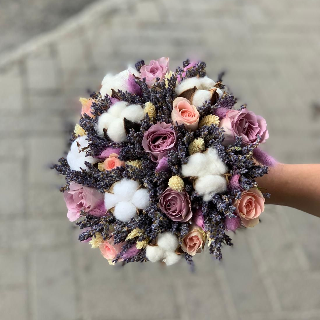 Эксклюзивный букет невесты из лаванды, роз мемори, хлопка, лагуруса.