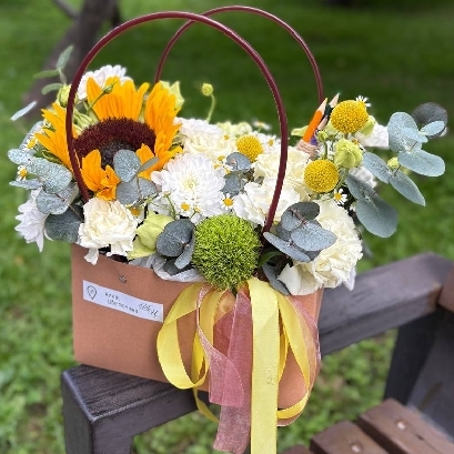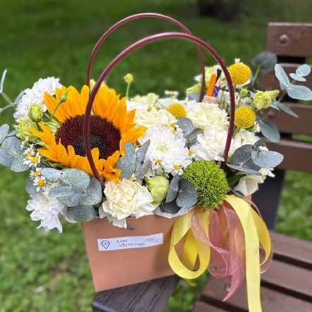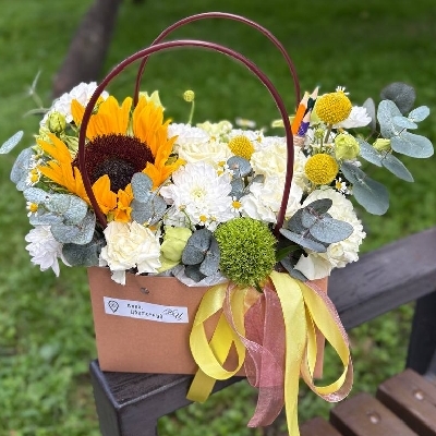 Диантус, Краспедия, Подсолнух, Хризантема кустовая, Эвкалипт, Эустома;