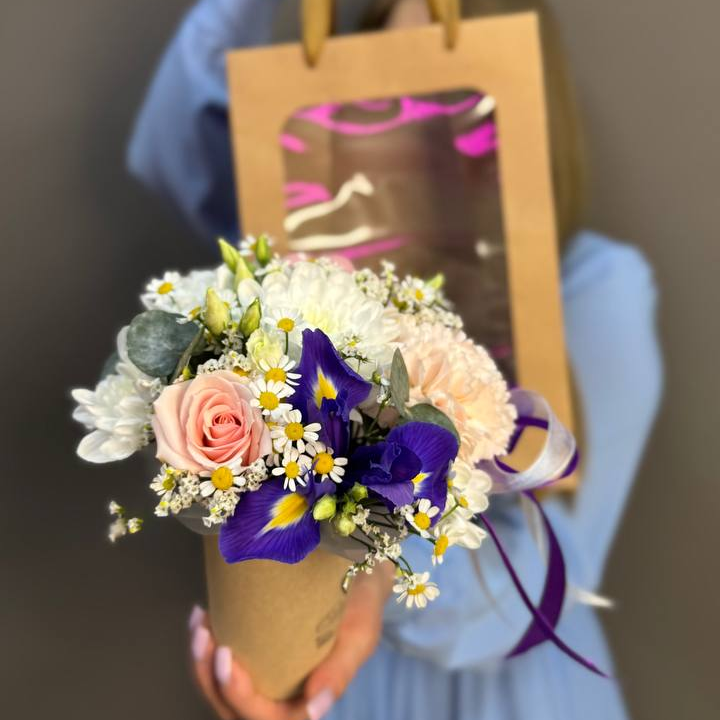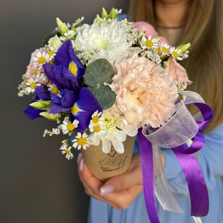Яркий цветочный стаканчик в крафтовом пакете