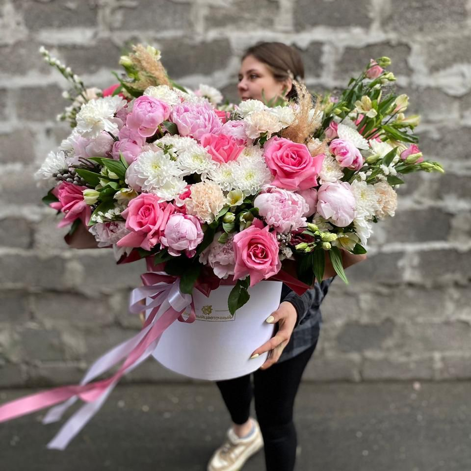 Гвоздика, Зелень, Пион, Роза, Роза кустовая, Хризантема, Эустома;