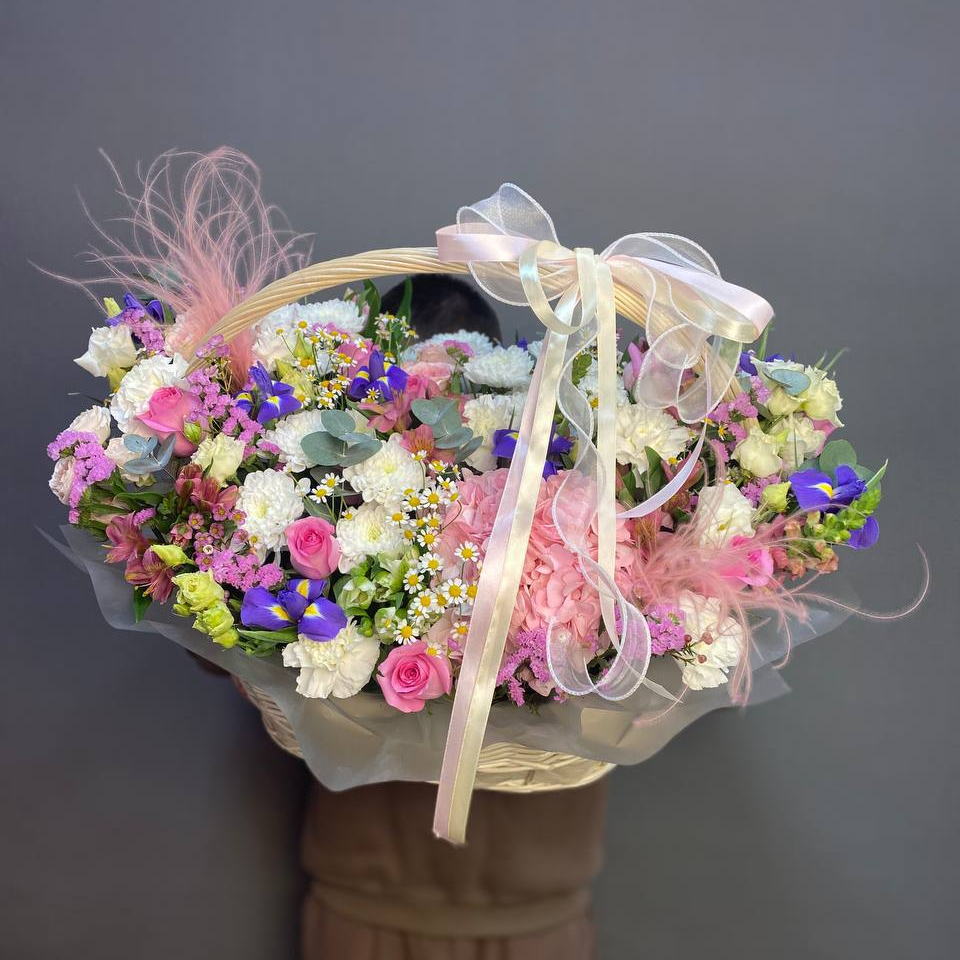 Гортензия 1, Ирис 7, Статица 3, Роза 7, Танацетум 4, Альстромерия 6, Хризантема 4, Диантус 7, Эустома 5, Хамелациум 2, Ковыль сухоцвет 2, Эвкалипт 2, Корзина 2300, Лента 3, Оазис 3