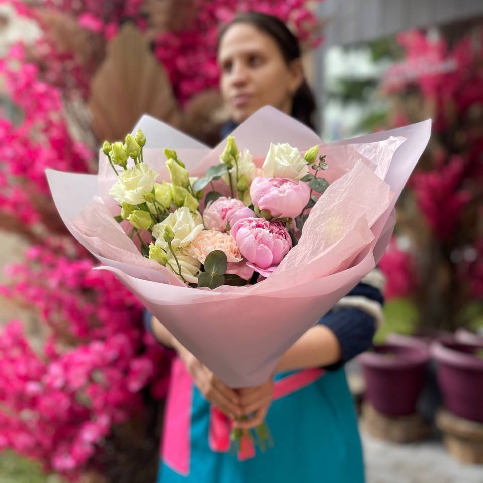 Состав: пион, эустома, диантус, эвкалипт, дизайнерская упаковка.