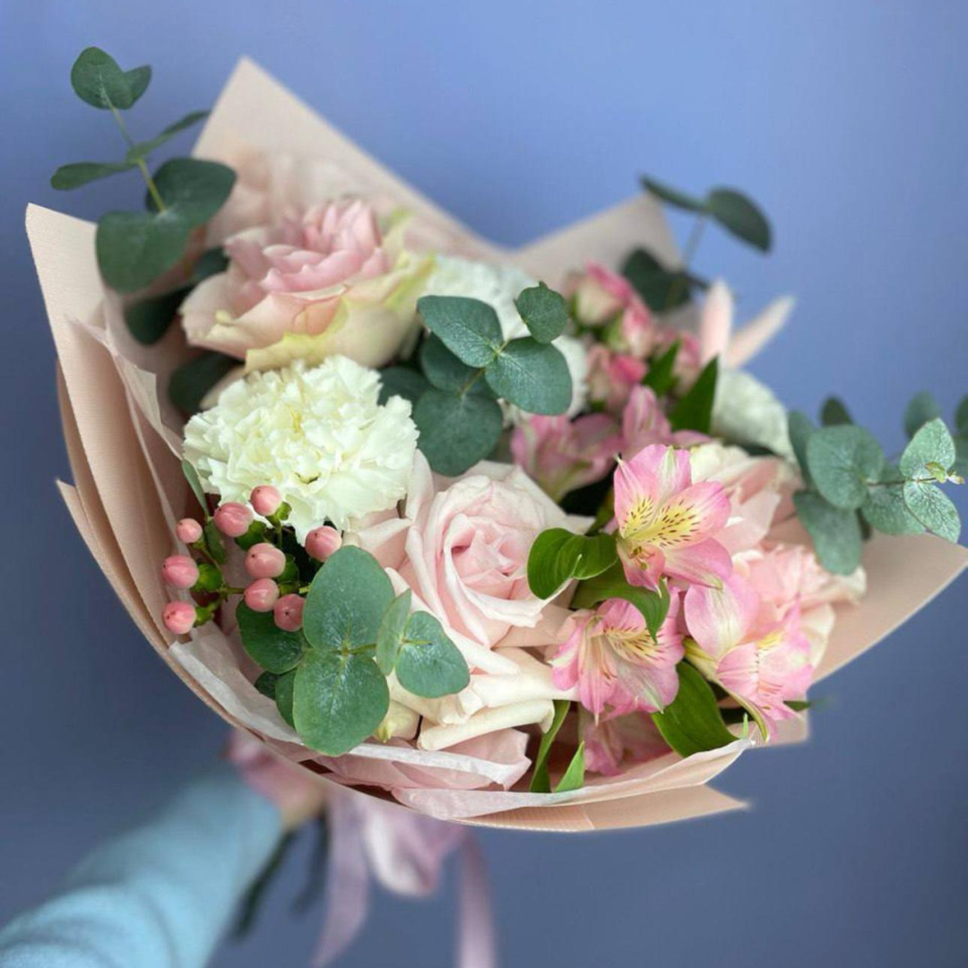 Альстромерия, Гиперикум, Диантус, Роза, Роза кустовая, Эвкалипт;