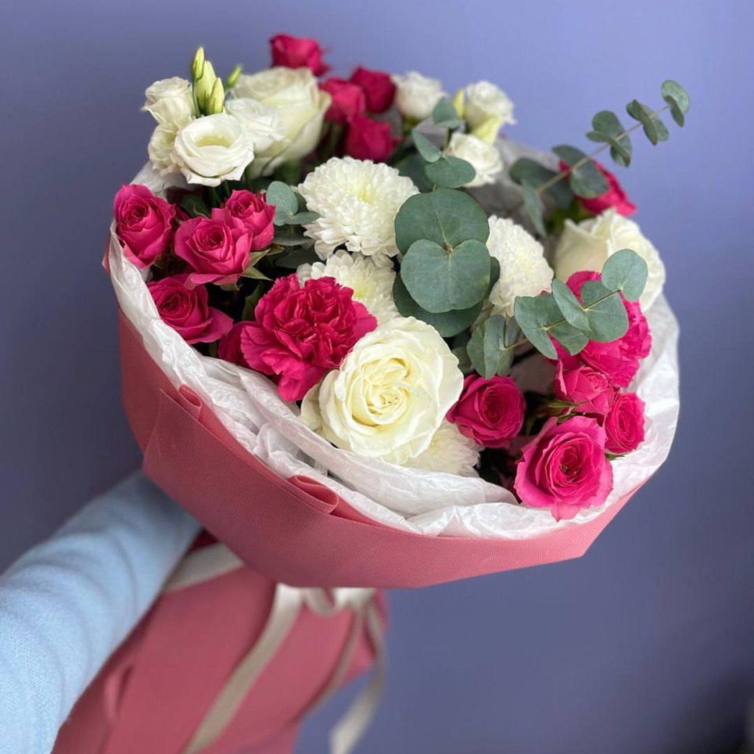 Диантус, Роза, Роза кустовая, Хризантема, Эвкалипт, Эустома;