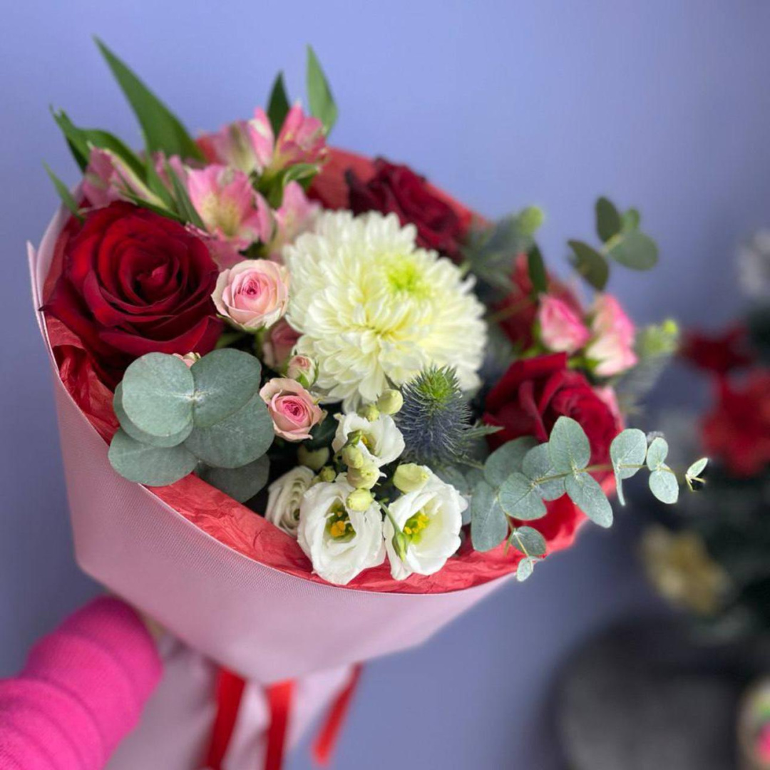 Альстромерия, Роза, Роза кустовая, Хризантема, Эвкалипт, Эустома;