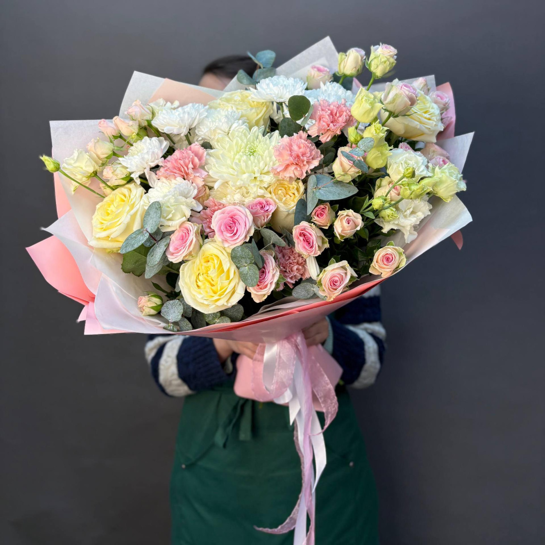 Диантус, Роза, Роза кустовая, Хризантема, Хризантема кустовая, Эвкалипт, Эустома;