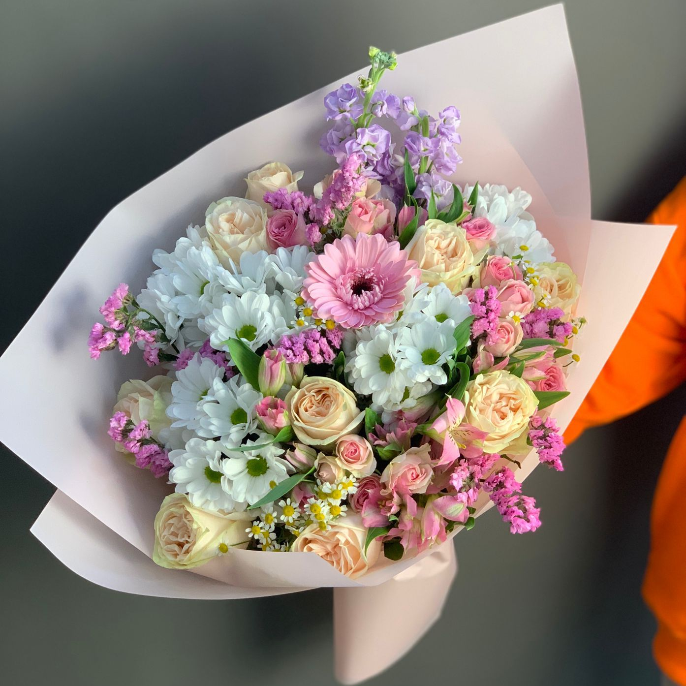 Альстромерия, Гербера, Маттиола, Роза, Статица, Хризантема кустовая;