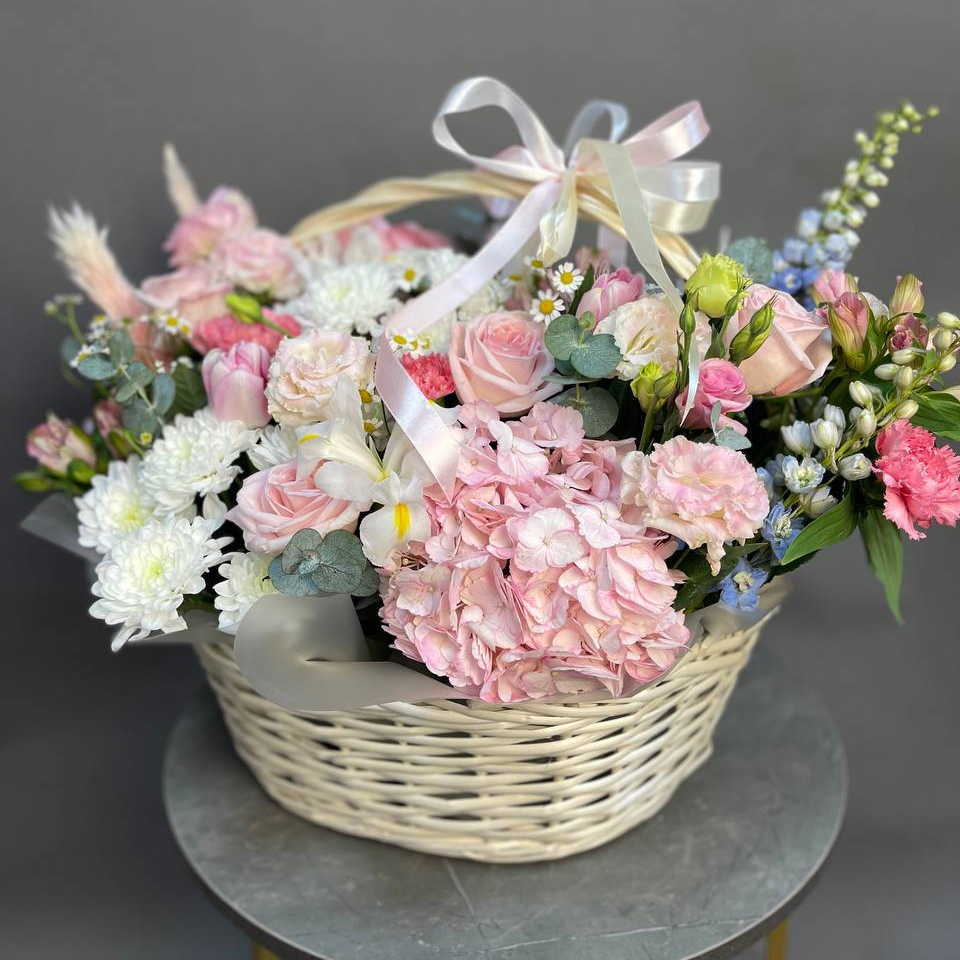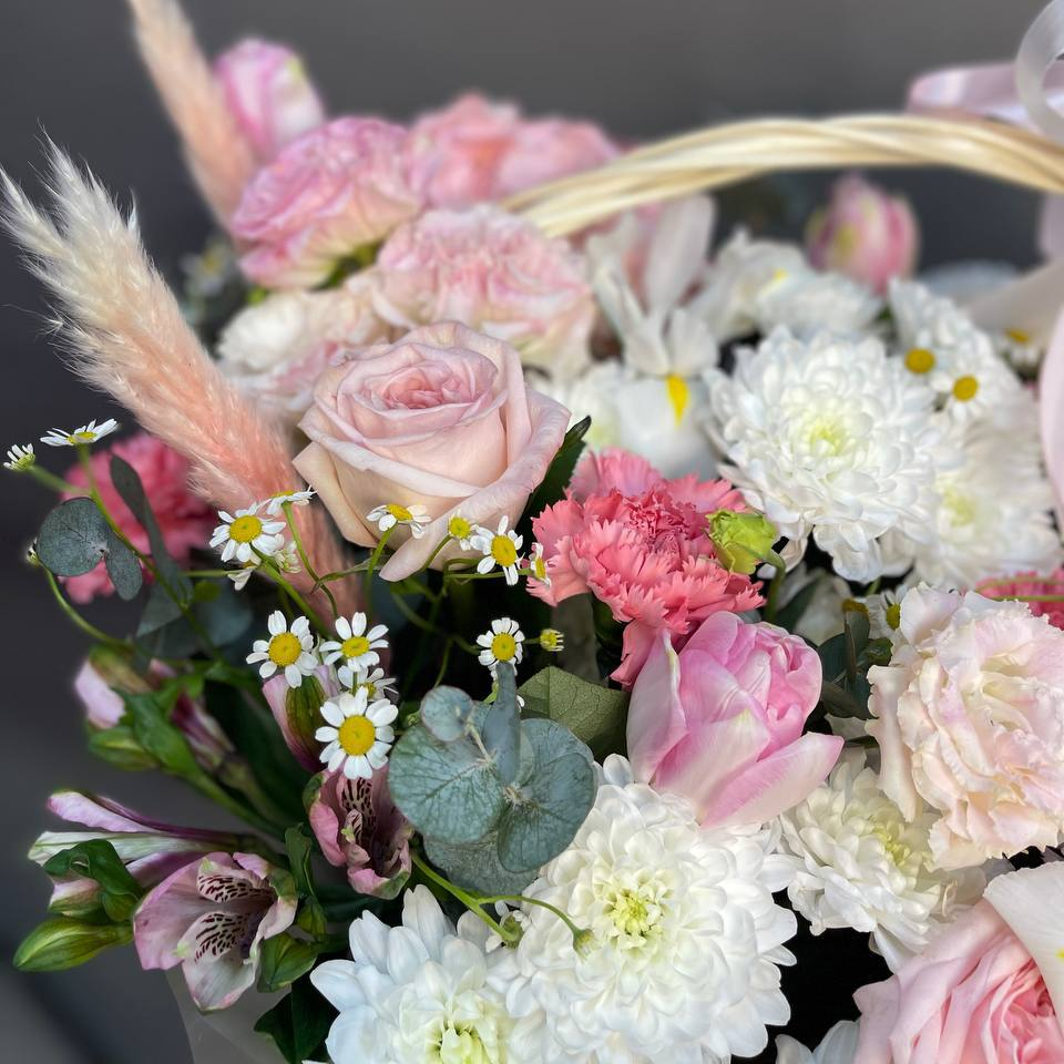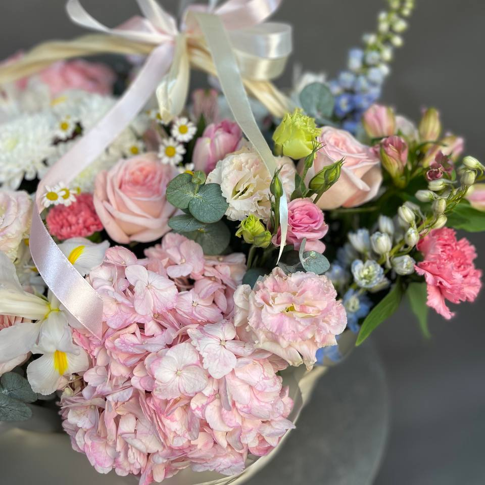 Альстромерия, Гортензия, Дельфиниум, Диантус, Роза, Танацетум, Тюльпан, Хризантема, Эвкалипт, Эустома;